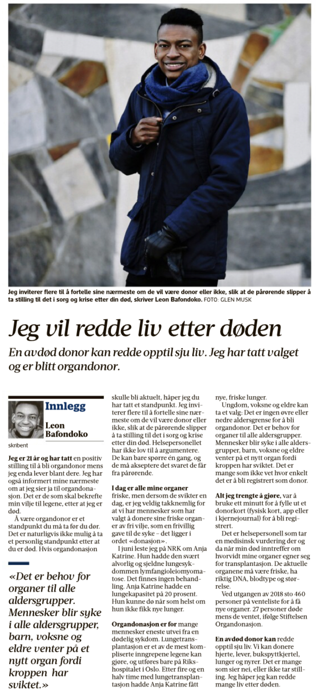 Jeg er 21 år og har tatt en positiv stilling til å bli organdonor mens jeg enda lever blant dere. Jeg har også informert mine nærmeste om at jeg sier ja til organdonasjon. Det er de som skal bekrefte min vilje til legene, etter at jeg er død.
