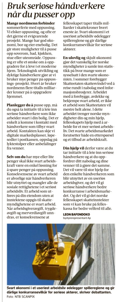 Din hjelp vil derfor være at du tar initiativ til å leie inn seriøse håndverkere og at du oppfordrer ditt nabolag og dine venner til å gjøre det samme. Det vil være til stor hjelp for den enkelte håndverkeren som blir utnyttet av en useriøs arbeidsgiver, og det vil gi seriøse håndverkere bedre konkurranse i arbeidsmarkedet. Og det vil gi det norske fellesskapet skatteinntekter som vi kan bruke på felleskassa for bedre velferd til alle.