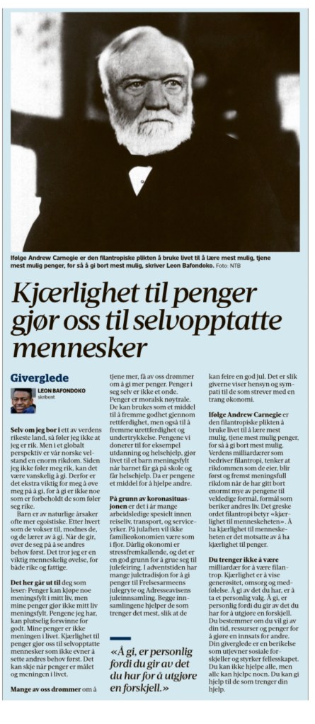 Selv om jeg bor i ett av verdens rikeste land, så føler jeg ikke at jeg er rik. Men i et globalt perspektiv er vår norske velstand en enorm rikdom. Siden jeg ikke føler meg rik, kan det være vanskelig å gi. Derfor er det ekstra viktig for meg å øve meg på å gi, for å gi er ikke noe som er forbeholdt de som føler seg rike.