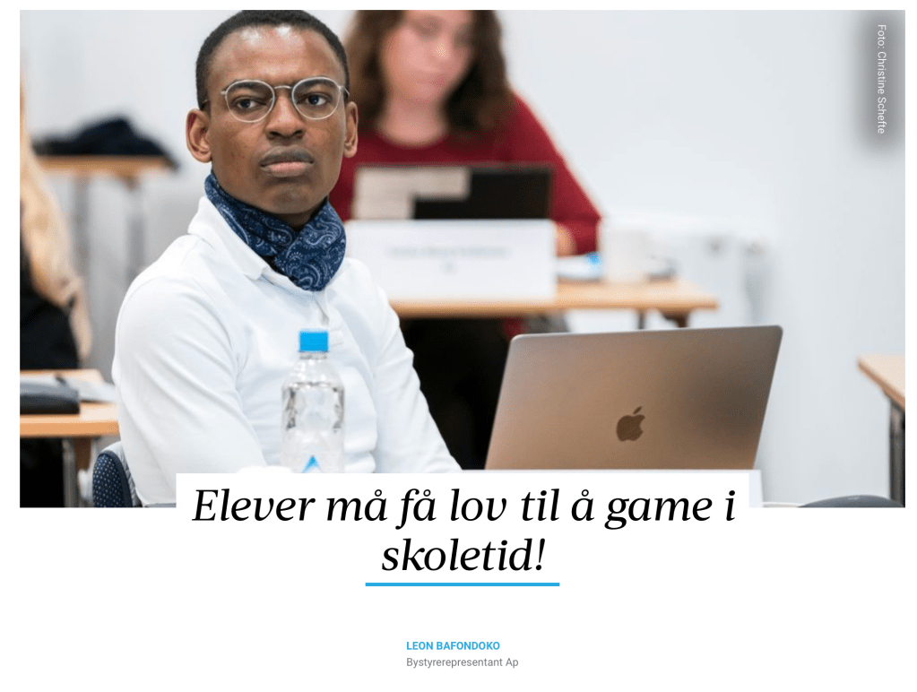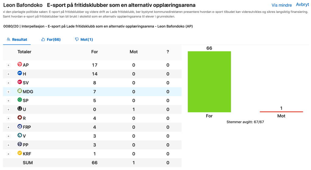 Derfor er jeg glad for at alle partiene i bystyret vedtok på torsdag at i den planlagte politiske saken: E-sport på fritidsklubber og videre drift av Lade fritidsklubb, ber bystyret kommunedirektøren presentere hvordan e-sport tilbudet kan videreutvikles og sikres langsiktig finansiering. Samt hvordan e-sport på fritidsklubber kan bli brukt i skoletid som en alternativ opplæringsarena til elever i grunnskolen.