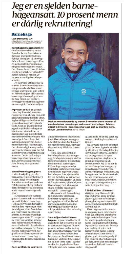 10 prosent er ikke en god rekruttering. En enkel rekrutteringsstrategi er å bruke menn til å rekruttere flere menn til yrket. Jeg har tidligere arbeidet tre år i grunnskolen og videregående skole. Noen av grunnene til at jeg søkte jobb i barnehagen er blant annet at min leder er mann og det var allerede flere menn tilstede i barnehagen. Min mannlige leder er leder i et kvinnedominert yrke, han er min rollemodell i barnehagen. Det ble naturlig for meg å søke interesse i en barnehage der det allerede var et arbeidsfellesskap av menn. Derfor tenkte jeg at barnehagen kan også være et godt, lærerikt og spennende yrke for ung 23 år gammel mann.