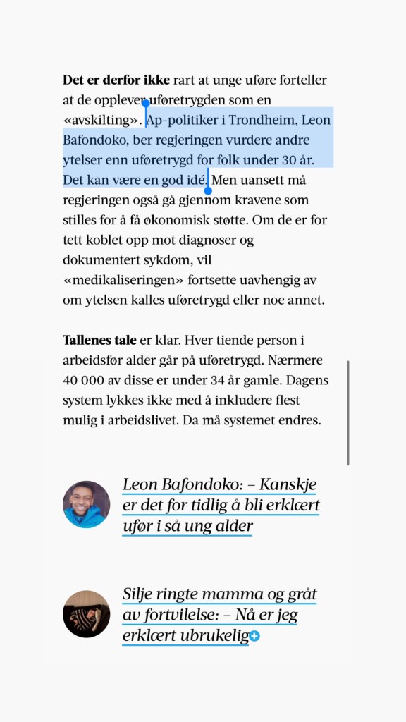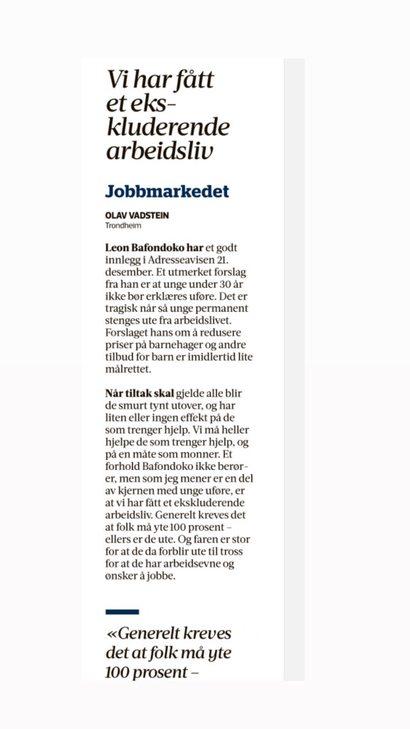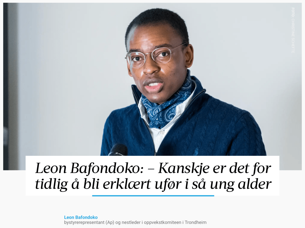 Fredag 23.Desember på trykk støttet Adresseavisen mitt debattinnlegg på lederplass med å skrive dette om mitt politiske innspill til Støre-regjeringen: «Ap-politiker i Trondheim, Leon Bafondoko, ber regjeringen vurdere andre ytelser enn uføretrygd for folk under 30 år. Det kan være en god idé. » -Adresseavisen 23.desember.2022