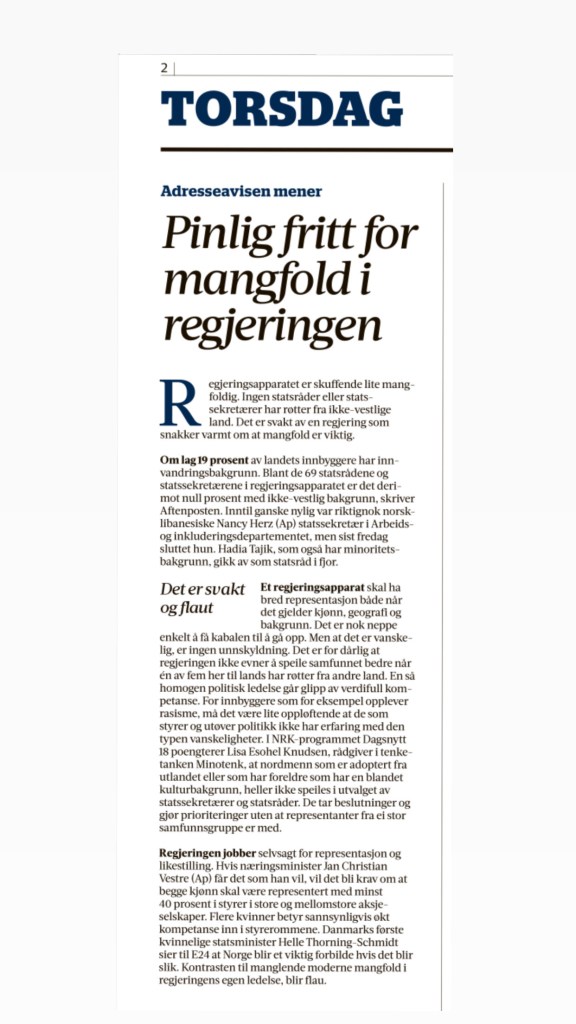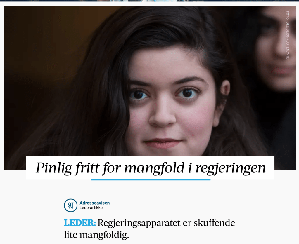 Link til adresseavisens lederartikkel: «Pinlig fritt for mangfold i regjeringen»