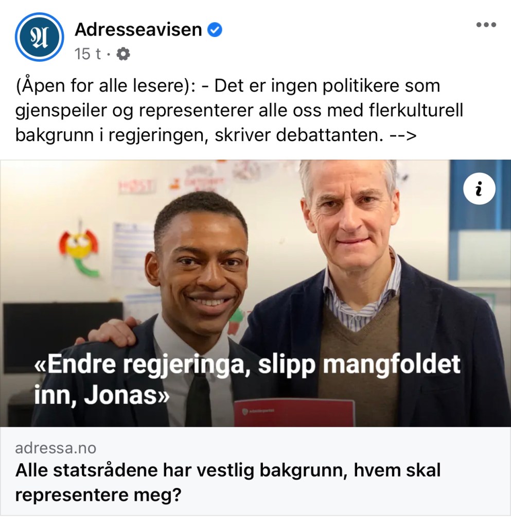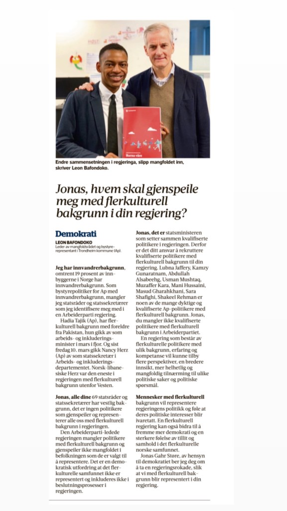 Jonas Gahr Støre, av hensyn til demokratiet ber jeg deg om å ta en regjeringsrokade, slik at vi med flerkulturell bakgrunn blir representert i din regjering.